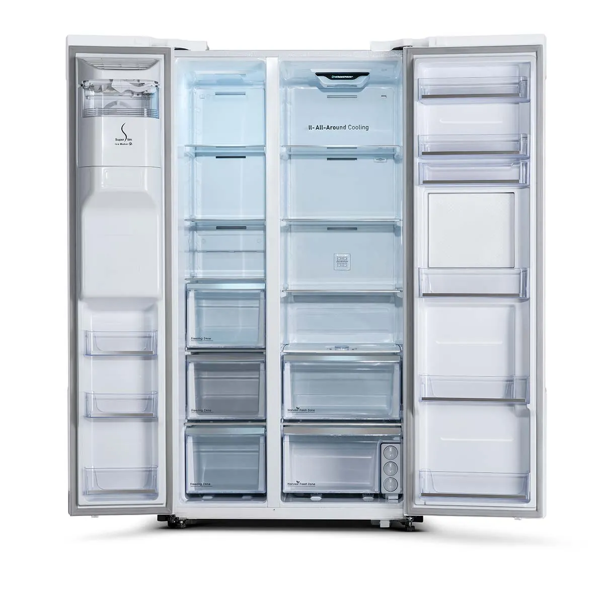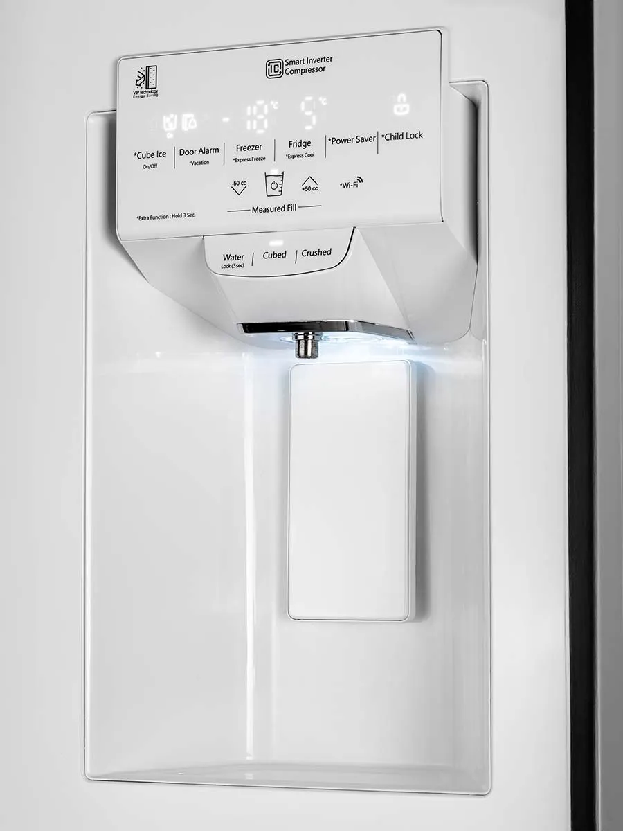 دارای هوم بار با درب فلزی، نمایشگر روی درب، قابلیت تولید یخ مکعبی و یخ خرد شده، آبسردکن هوشمند با قابلیت آبگیری با حجم دلخواه، مجهز به فیلتر سه گانه آب، تعویض آسان فیلترها از جلو، مجهز به دئودورایزر جهت باکتری زدایی محیط یخچال و فریزر، دستگیره مخفی بلند، مجهز به دریچه کنترل رطوبت برای جا میوه ای یخچال، گنجایش 32 فوت، گرید مصرف انرژی +A، پیچ تنظیم ارتفاع، دارای ولوم تنظیم دما، طبقات شیشه ای نشکن
