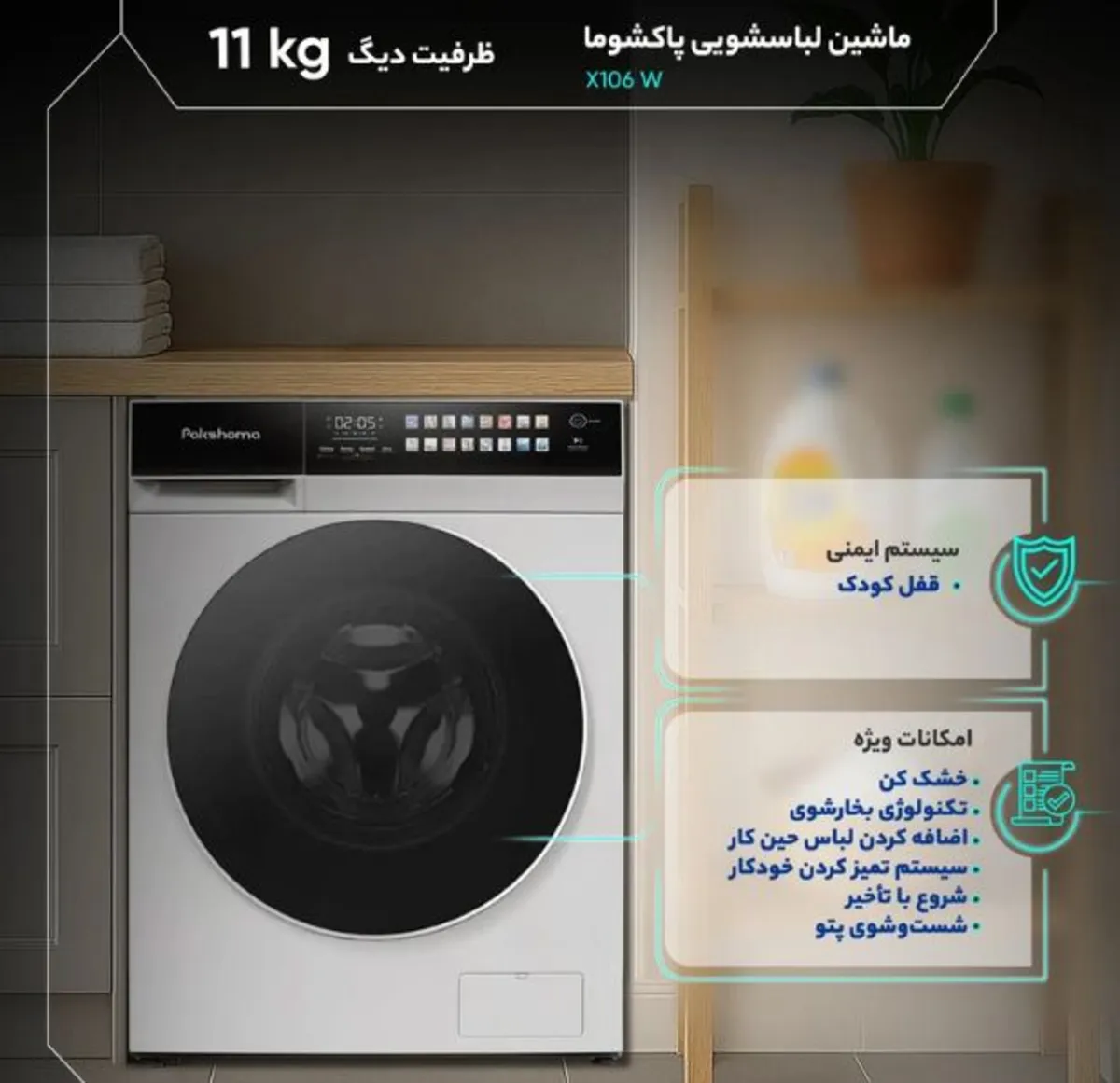 ماشین لباسشویی اتوماتیک پاکشوما مدل X106 با ظرفیت 11 کیلوگرم، پاسخی فنی و دقیق به نیاز خانوادههای پرجمعیت یا کاربرانی است که شستوشوی اقلام بزرگ و حجیم را بهطور منظم انجام میدهند. این مدل با ساختاری که بر اساس عملکرد عملیاتی و دوام طراحی شده، امکان شستوشوی اقلامی مانند پتوهای دونفره، روکشهای ضخیم یا مجموعه کامل لباسهای یک هفته خانواده را در یک چرخه فراهم میکند و در نتیجه زمان و انرژی صرفشده برای شستوشو بهطور محسوسی کاهش مییابد.